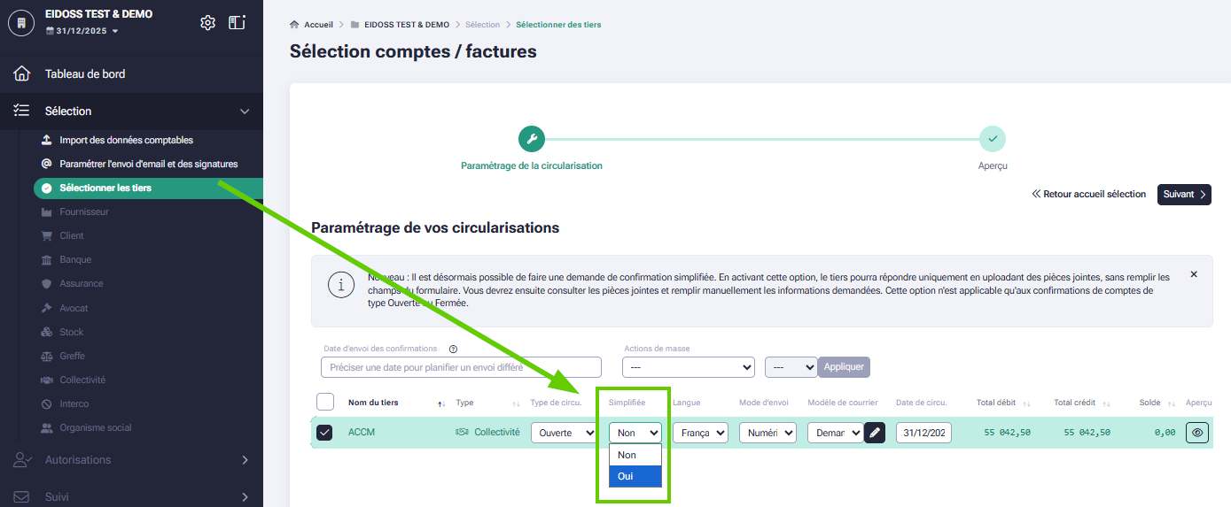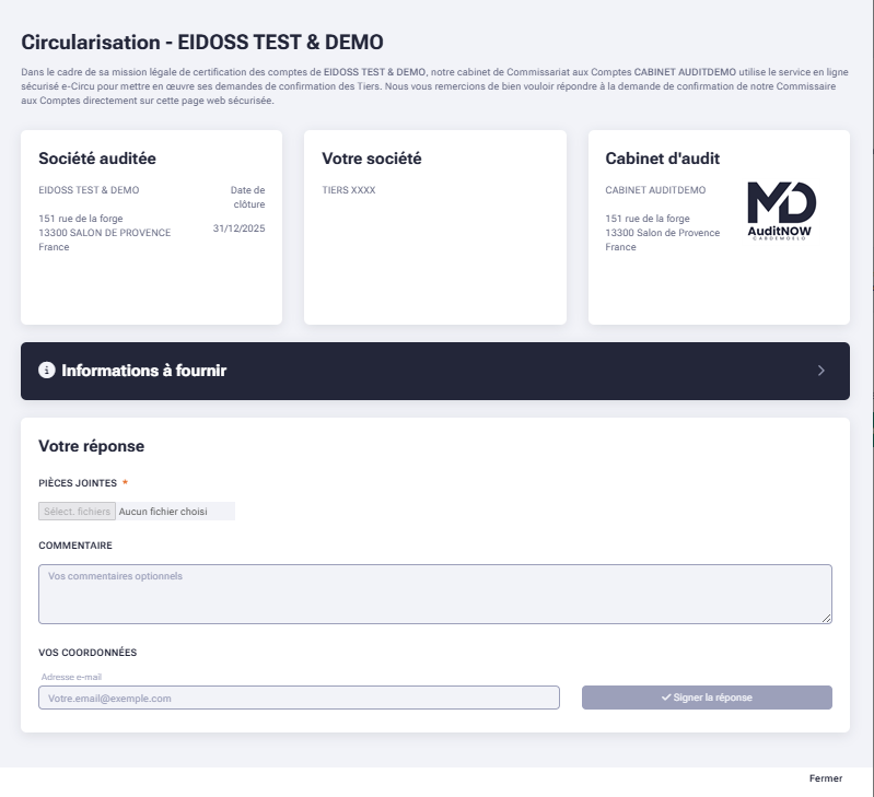 Nouveau : découvrez la demande simplifiée ! Une nouvelle façon d’engager les tiers et d’augmenter les taux de retour avec une interface plus simple et épurée, toujours dans le respect de la NEP 505. Avec la demande simplifiée, le tiers fournit directement ses pièces jointes. Il n’a que son adresse mail à remplir ! Côté CAC, saisissez directement les montants confirmés via les pièces jointes dans la section « Traitement de la réponse du tiers ». Finis les erreurs de saisie et les échanges superflus!